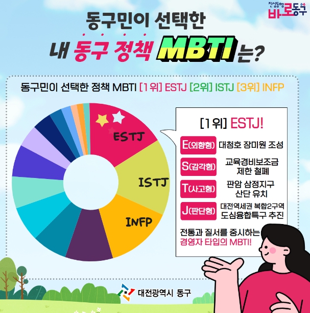 많은 구민들의 이벤트 참여 결과, 동구민들이 뽑은 동구의 민선 8기 대표 정책 MBTI는 ‘ESTJ(경영자)’로 뽑혔다.