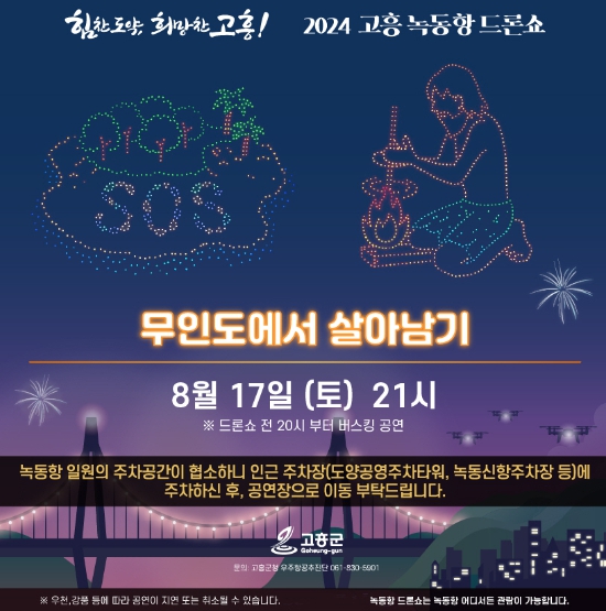 한편, 고흥군은 드론 중심 도시 이미지를 제고하고 야간 관광을 활성화하기 위해 지난 4월부터 매주 토요일 드론쇼를 상설 운영하고 있으며, 오는 추석 연휴 기간 중인 9월 14일부터 17일까지 특별공연을 개최한다.
