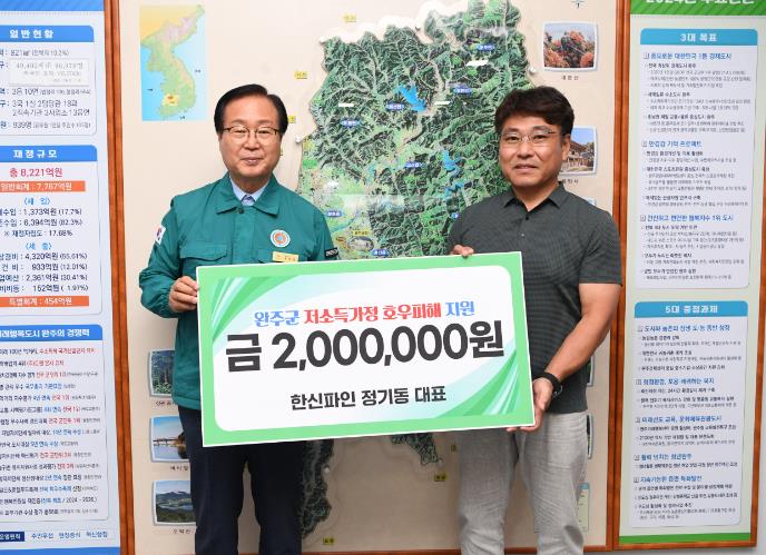 [뉴스서울] 완주군 운주면에 위치한 ㈜한신파인이 집중호우로 큰 피해를 입은 완주군에 성금 200만 원을 기탁했다.