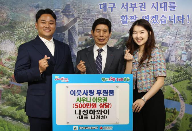 [뉴스서울] 대구 달서구는 지난 26일 나성하와이(대표 나경성)로부터 사우나 이용권(500만원 상당)을 기탁받았다.