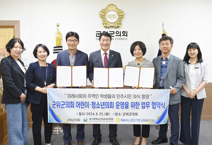 [뉴스서울] 대구광역시 군위군의회가 군위군 어린이·청소년의회 설립 및 운영을 위해 군위군의회, 대구광역시군위교육지원청, NH농협은행 군위군지부 3자간 업무협약을 체결했다.