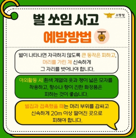 벌 쏘임 사고는 벌의 활동이 왕성한 7~8월에 많이 발생하여 실외 작업이나, 등산, 벌초 시 사고 빈도가 높다. 벌에 쏘이게 되면 심각한 알레르기 반응을 일으켜 생명을 위협할 수 있어 시민들은 야외활동 시 각별한 주의가 필요하다.