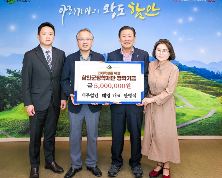 [뉴스서울] 세무법인 태영(창원시 마산합포구 산호동 소재) 안병석 대표는 10일 함안군청을 방문해 지역인재육성을 위한 장학기금 500만 원을 군 장학재단에 기탁했다.