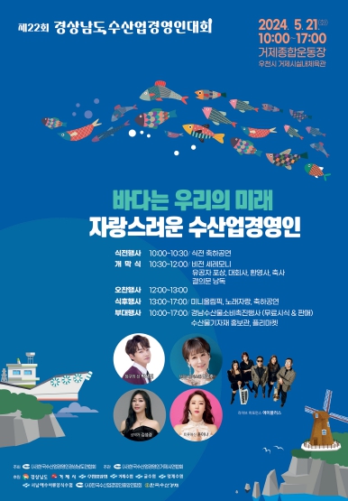 [뉴스서울] “바다는 우리의 미래, 자랑스러운 수산업경영인” 슬로건으로 수산업경영인 저력 표출 및 화합을 위한 경상남도 수산업경영인 대회를 오는 2024년 5월 21일 거제종합운동장에서 개최한다.