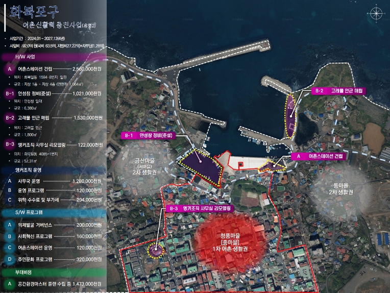 화북항 어촌신활력증진사업(유형2)은 2024년부터 2027년까지 92억 원(국비 63억 5,000만 원, 도비 27억 2,000만 원, 자부담 1억 3,000만 원)을 투자해 돌봄, 교육 등 생활서비스 거점시설을 조성하고, 관계인구 유입 및 창업지원을 통해 활력 넘치는 어촌을 만드는 사업이다.