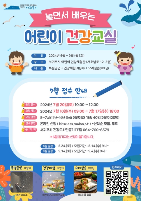 [뉴스서울] 서귀포시는 오는 7월 10일부터 ‘7월 어린이 건강교실’참가 가족을 모집하고 7월 20일 토요일 어린이 건강체험관에서 프로그램을 운영한다.