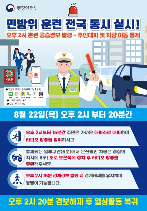또한, 행정안전부 주관으로 8월 22일 오후 2시부터 20분간 전국적으로 을지연습 연계 공습대비 민방위 훈련이 실시된다.