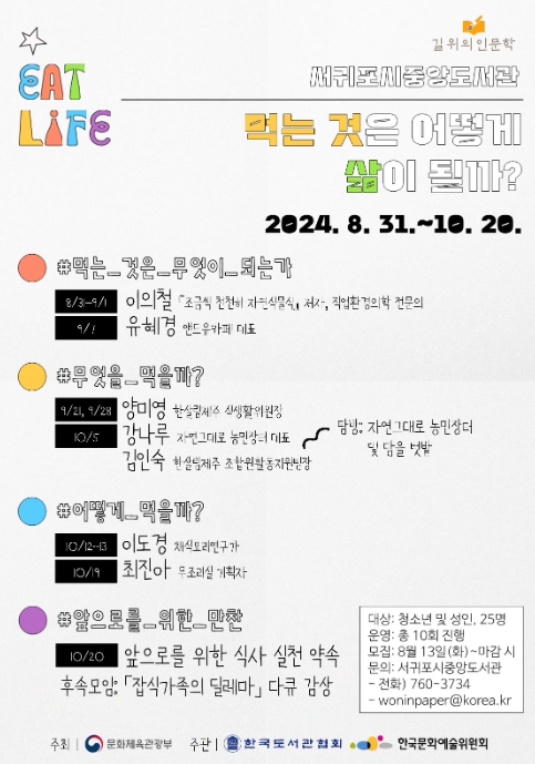 서귀포시중앙도서관은 ‘먹는 것은 어떻게 삶이 될까?’라는 주제로 8월 31일부터 10월20일까지 총 10회에 걸쳐 강연(8), 탐방(1), 후속모임(1)을 운영한다.