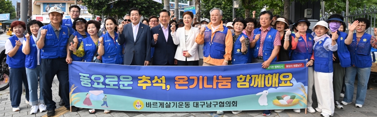 이날 이흥우 회장을 비롯한 100여명의 바르게살기운동 대구남구협의회 회원들은 남구청네거리에서 ‘풍요로운 추석, 온기나눔 함께해요’라는 주제로 추석 명절 소외된 주변 이웃을 살피고 풍요롭고 따뜻한 한가위를 보내자는 취지로 캠페인을 진행했다.