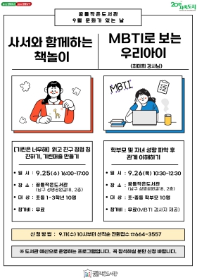 또한, 9월 26일에는 ‘MBTI로 보는 우리 아이’라는 주제로 학부모를 위한 강연을 진행할 예정으로 이 강연에서는 자녀의 MBTI 성격 유형 이해와 효과적인 소통 및 교육 방법에 대해 알아보고, 참석한 학부모들은 자신의 MBTI 성격 유형 검사를 통해 자녀 교육에 더 깊이 있는 통찰을 얻을 수 있다.