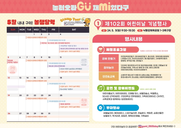 또한, △보물찾기 △버블놀이터 △하늘분수존 △구미캐릭터 벽화놀이터 △스포츠체험존 △에어바운스(유아·아동 구분)가 준비돼 있다.