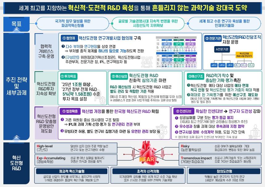 이러한 상황에서 그간 정부가 추진한 선도형 R&D 전환 정책이 일부 성과*가 있었으나 여전히 정부 R&D의 혁신도전성 수준 및 혁신도전적 R&D 지원환경에 대한 현장의 체감도는 낮은 (설문조사(’24.1, 7점 만점), 혁신도전성 수준 3.4점, 지원환경 3.2점) 것이 현실이다. 혁신과 도전의 DNA를 빠르게 우리 연구개발생태계에 확산시키기 위해서는 혁신적 도전적 R&D에 대한 기존 관성을 뛰어넘는 과감한 정책적 뒷받침과 부처를 아우르면서 현장을 관통하는 원팀을 구성해야 한다는 분석하에 '혁신도전형 R&D 사업군 제도' 시행과 함께 ①거버넌스, ②투자 ③제도 측면에서 혁신적 도전적 R&D를 제대로 키우기 위한 추진과제를 마련했으며 그 주요 내용은 다음과 같다.