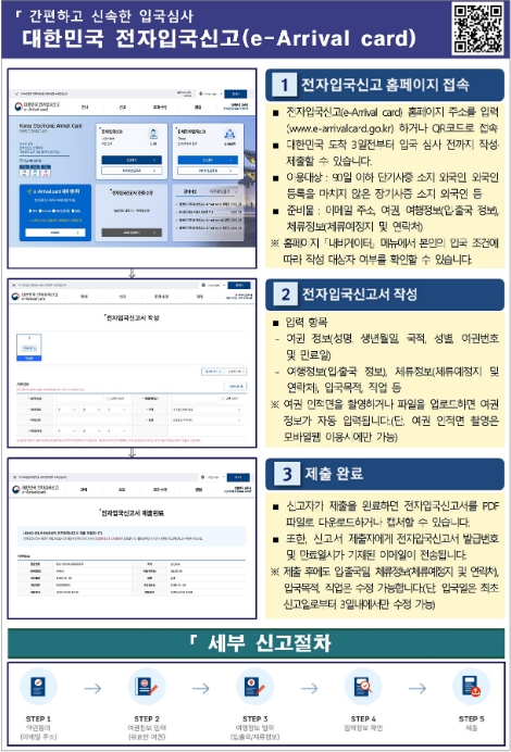 전자입국신고서는 PC 또는 스마트폰에서 전자입국신고 홈페이지를 접속(QR 코드로도 가능)하여 대한민국 도착 3일 전부터 입국심사를 받기 전까지 작성·제출할 수 있다.