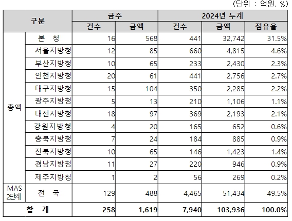 지역별 발주량을 보면, 총액계약 대상 1,131억 원 중 본청이 568억 원으로 50.2%를 집행하고 서울청 등 11개 지방청에서 563억 원을 각각 집행할 예정이다.