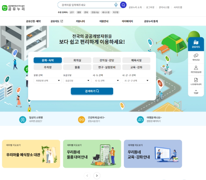 ‘공유누리’ 홈페이지에서 ‘예식’, ‘웨딩’ 등 키워드를 입력하여 전국의 공공 예식공간을 한 번에 검색할 수 있고, ‘우리마을 예식공간 대관’ 테마 지도를 통해 원하는 지역의 공공 예식공간 및 하객들이 이용할 수 있는 주차장, 전기차충전소 등 편의시설의 위치를 확인할 수 있다.