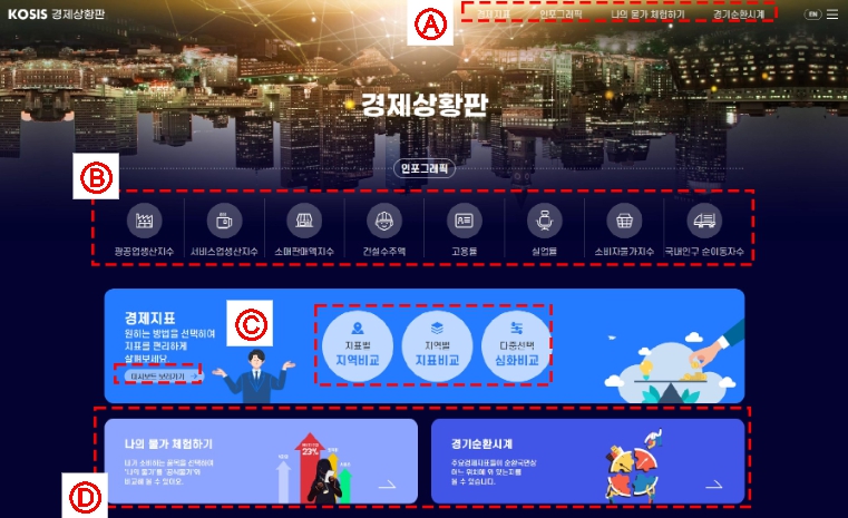 또한, 분기별로 공표하는 지역별 경제동향에 대해 인포그래픽을 이용해 시의성 있게 제공하며, 기존의 '나의 물가 체험하기'와 '경기순환시계'와 같은 경제 관련 콘텐츠를 함께 이용할 수 있어 더욱 편리하다.