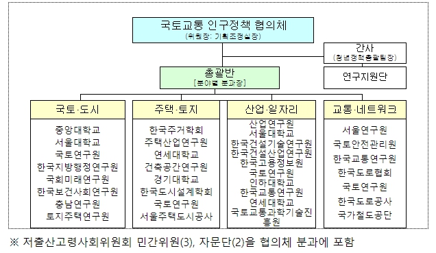 논의의 효율성을 위해 4개 분과로 구분되며 분야별 분과장이 참여하는 총괄반에서 전체방향을 조율하고, 국토연구원에서 연구지원을 담당한다.