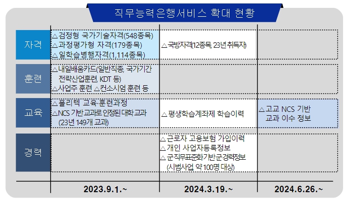 ‘직무능력은행’은 개인이 습득한 자격·훈련·교육·경력 등 직무능력정보를 저축·통합관리하고, 필요한 때 ‘직무능력 인정서’ 형태로 발급받아 취업이나 인사 배치 등에 활용할 수 있도록 지원하는 제도이다. 이 제도는 자격․교육․훈련 정보를 중심으로 2023년 9월 1일부터 서비스를 시작했고, 올해 3월 19일에는 고용보험 가입이력, 개인 사업자등록정보, 평생학습계좌제 학습이력 등 정보연계를 확대한 바 있다.
