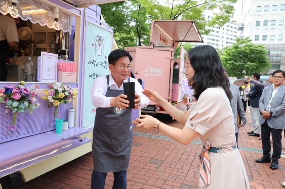 [뉴스서울] 박강수 마포구청장은 민선 8기 2주년 첫날인 7월 1일 오전, 구청 앞 광장에 마련된 ‘사랑의 커피차’에서 직원들에게 직접 커피를 건네며 격려의 말을 전했다.