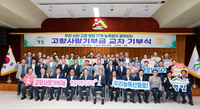 영암군이 6/27일 영암군민회관에서 영암·고흥·무안·신안군의 17개 농·축협 임직원 100여 명이 참석한 가운데 ‘고향사랑기부금 교차기부식’을 열었다.