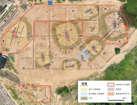 이번에 공개된 대형급 고분(둘레 약 14에서 16m×10에서 14m)은 구릉 위에 일렬로 분포된 양상을 보이고 있다.