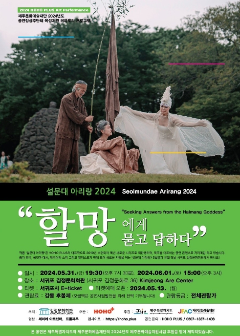 [뉴스서울] 서귀포시 김정문화회관은 2024년 공연장 상주단체 육성지원 사업의 일환으로 제주예술단체 ‘HOHO PLUS’의 '설문대 아리랑 2024 “할망에게 묻고 답하다”' 공연을 오는 5월 31일 19시 30분, 6월 1일 13시에 개최한다.