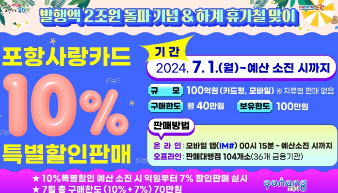 [뉴스서울] 포항시가 내달 1일부터 포항사랑상품권 누적 발행액 2조 원 돌파를 기념해 포항사랑카드와 모바일 포항사랑상품권 100억 원을 10% 특별할인 판매한다.