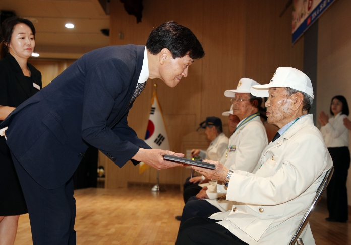▲ 지난 25일 밀양시청 대강당에서 열린 제74주년 6.25전쟁 기념식에서 안병구 밀양시장이 참전용사에게 감사패를 전달하고 있다. |