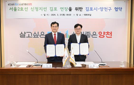 [뉴스서울] 양천구는 경기도 김포시와 함께 철도교통망 확충을 위한 ‘서울 2호선 신정지선 김포 연장(까치산역 부터김포) 업무협약’을 체결했다.