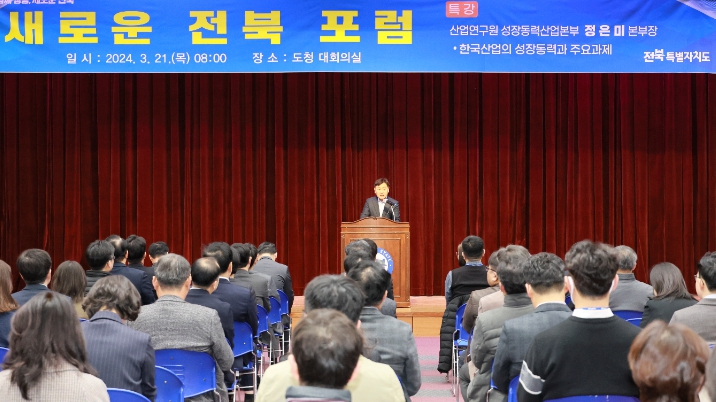 전북특별자치도는 21일 ‘3월 새로운 전북 포럼’을 개최했다.이날 김 지사는 도청 대회의실에서 실‧국장, 팀장급 이상 간부 공무원 200여명과 함께 ‘한국산업의 성장동력과 주요과제’를 주제로 공부하고 열띤 토론을 이어갔다.
