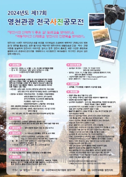사진에 관심 있는 누구나 참여 가능하며, 사진은 2023년 10월 1일 이후 본인이 직접 촬영한 작품으로 영천9경의 재발견(은해사, 임고서원, 보현산 천문대, 치산 관광지, 보현산댐 출렁다리&짚와이어, 운주산승마자연휴양림, 영천댐 벚꽃백리길, 영천한의마을, 별별미술마을), 숨어있는 관광자원 발굴(주요 관광지 이외)과 영천관광 이모저모(영천시 관내 캠핑장 및 각종 축제, 문화행사) 3개 분야로 열린다.