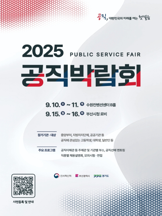 인사혁신처는 중앙행정기관, 지방자치단체, 공공기관 등 70개 이상 기관이 참가해 다양한 공직 채용 정보를 제공하는 ‘2025 공직박람회’를 수원과 부산에서 각각 개최한다고 19일 밝혔다.