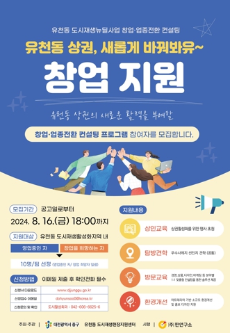 [뉴스서울] 대전 중구는 유천동 도시재생 뉴딜사업의 일환으로 ‘창업·업종 전환 컨설팅(2차)’ 참여자(10명)를 오는 8월 16일까지 모집한다고 밝혔다.