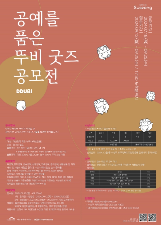 접수 작품은 수성구 캐릭터 뚜비를 주제로 한 공예품이거나 디자인 관련 소재와 기술을 활용한 창작물(굿즈)이다.