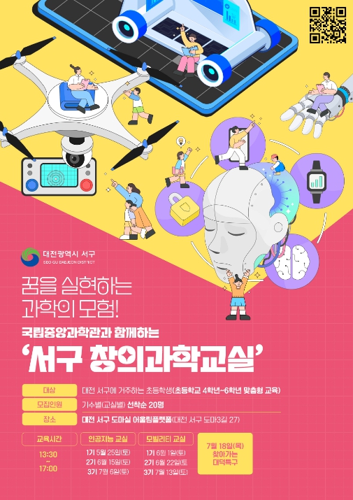 먼저 구는 인공지능(AI), 모빌리티 2개 과정으로 ‘창의과학교실’을 운영한다. 프로그램은 국립중앙과학관의 전문적인 교육 콘텐츠와 강사를 활용하며 도마실 어울림플랫폼에서 진행된다. 창의과학교실 이수자는 대덕특구 출연연을 탐방하는 ‘찾아가는 대덕특구’ 프로그램에 참여하게 된다.