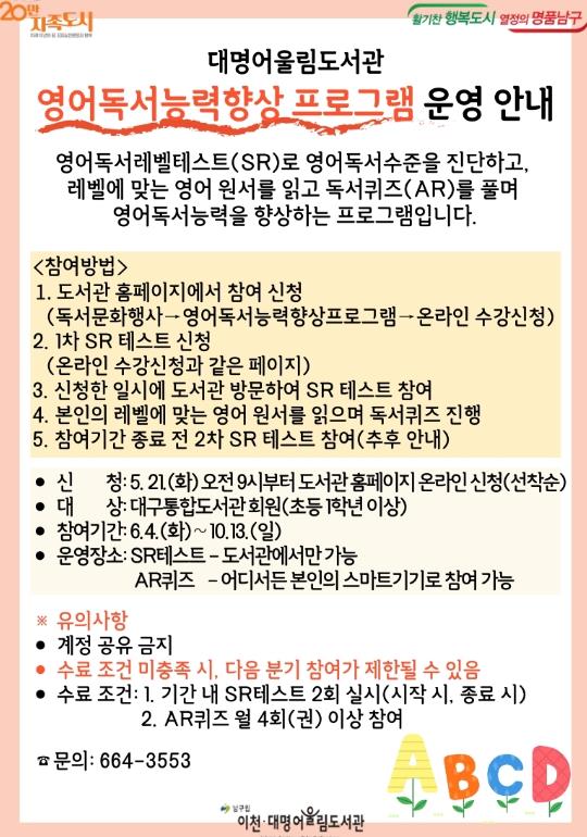 또한 프로그램에 참여하지 않더라도 주민 누구나 6월부터 대명 어울림도서관 어린이자료실에서 영어 읽기 수준 진단(SR)이 가능하다.