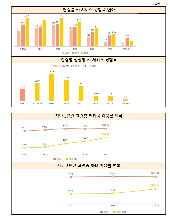 [고령층 인터넷 이용] 또한 이번 실태조사에서 고령층(60세 이상)의 인터넷 이용률(최근 1개월 이내 인터넷 이용자)은 81.1%로 나타났다. 그 중 70대 이상의 인터넷 이용률(64.4%, 9.7%p↑)과 SNS이용률(26.4%, 5.3%p↑)이 크게 상승했다. 70대 이상의 인터넷 활용 목적을 설문한 결과, ‘교육‧학습’으로 답변한 비중이 전년 대비 크게 증가(33.0%, 25.6%p↑)했으며, ‘직업‧직장(구직‧업무수행 등)’에 답변한 비중도 증가(12.8%, 10.6%p↑)한 것으로 나타났다. 70대 이상 인터넷 이용자가 양적으로 늘어나고 있는 가운데, 그 이용 형태에 있어서도 단순 정보 획득에서 더 나아가 학습 도구로 활용하거나 구직‧업무에 활용하는 등 보다 심화된 인터넷 이용이 늘어나고 있는 것으로 나타났다.