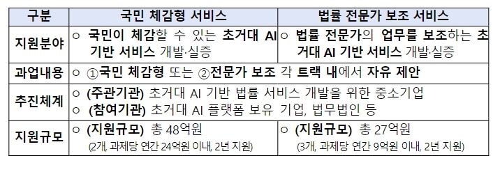 동 사업은 국민들에게 가까운 법률 상담 서비스 및 관련 서류 작성 등을 지원하는 국민체감형 과제(과제당 연간 24억원 규모, 2개 과제)와 법조인이 사용할 수 있는 참고자료 제시, 법률 검토 등 법률 전문가 보조 과제(과제당 연간 9억원 규모, 3개 과제)로 나누어 총 5개 과제를 공모를 통해 지원할 예정이다.