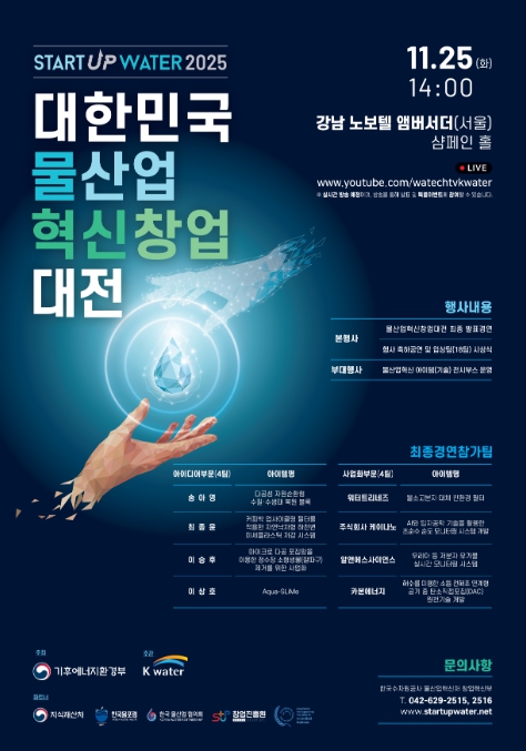 [뉴스서울] 기후에너지환경부와 한국수자원공사는 물산업을 우리나라의 새로운 성장동력으로 성장시킬 ‘혁신형 고성장 기업(유니콘)’을 발굴하기 위해 11월 25일 노보텔앰버서더호텔(서울 강남구 소재)에서 ‘대한민국 물산업 혁신 창업대전 2025’ 최종 경연을 개최한다고 밝혔다.