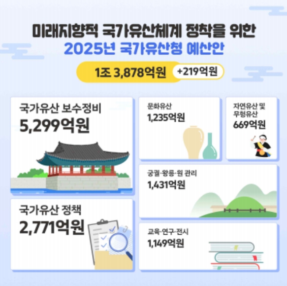국가유산청의 2025년도 정부안 예산규모는 1조 3,878억 원으로, 2024년 예산(1조 3,659억 원) 대비 219억 원(1.6%) 증액됐다. 분야별로는 ▲ 국가유산 보수정비 5,299억 원, ▲ 국가유산 정책 2,771억 원,▲ 문화유산 1,235억 원, ▲ 자연 및 무형유산 669억 원, ▲ 교육·연구·전시 1,149억 원, ▲ 궁능원 관리 1,431억 원 등의 예산을 투입할 예정이다.