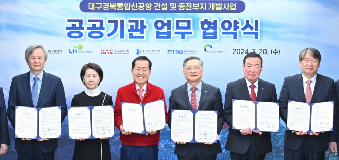 [뉴스서울] 대구광역시는 3월 20일 오전 10시 대구광역시 산격청사에서 한국토지주택공사, 한국공항공사, 대구도시개발공사, 대구교통공사, 경상북도개발공사와 '대구경북신공항 건설 및 종전부지 개발사업'의 성공적 추진을 지원하기 위한 업무협약을 체결했다.
