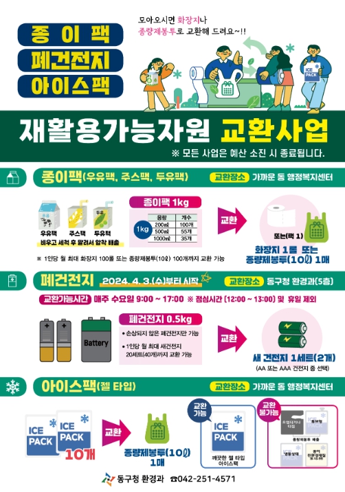 또, 폐건전지 교환 사업 외에도 종이팩 1kg을 화장지 한 롤 또는 종량제 봉투(10ℓ) 1매로, 젤 유형 얼음팩 10개를 종량제 봉투(10ℓ) 1매로 교환해주는 사업을 운영하고 있으며, 우유팩, 얼음팩 교환 사업은 가까운 동 행정복지센터를 방문하면 된다.
