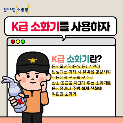강기원 소방서장은 “주방에서 발생하는 화재를 예방하기 위해서는 음식물 조리 시 자리를 비우지 않고 지켜보는 것이 중요하다”라며, “만약 주방 화재가 발생하더라도 주방에 K급 소화기를 비치한다면 신속한 대응이 가능하니 혹시 모를 주방화재를 위해 K급 소화기 비치를 당부드린다”라고 말했다.