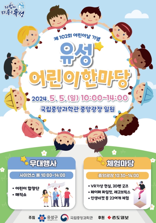 [뉴스서울] 대전시 유성구는 5월 5일 제102회 어린이날을 맞아 국립중앙과학관 중앙광장 일원에서 오전 10시부터 오후 2시까지 『유성 어린이 한마당』행사를 개최한다.