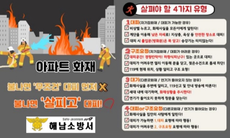 이에 따라 해남소방서는 아파트 화재와 관련한 국민 행동 요령 숙지의 필요성이 중요하다고 판단, 아파트 화재 시 “무조건 대피”가 아닌 화재 발생 및 대피 여건에 맞춘 “불나면 살펴서 대피” 슬로건을 홍보하고 있다.