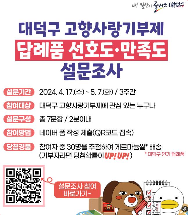 참여 방법은 대덕구청 홈페이지 등에서 QR 코드로 접속해 네이버 폼을 통해 온라인으로 참여할 수 있으며, 설문 참여자 중 추첨을 통해 총 30명에게 대덕구의 인기 답례품인 게르마늄이 함유된 쌀(4kg)을 지급할 예정이다.