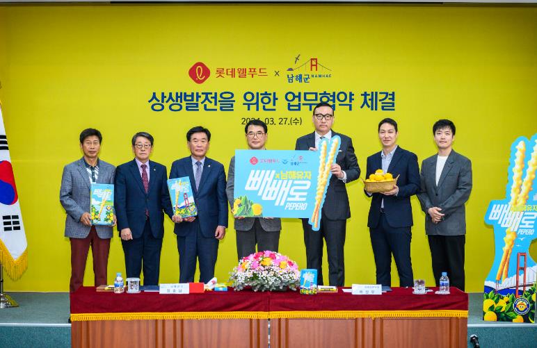 남해군과 롯데웰푸드는 27일 남해군청에서 상생발전을 위한 업무협약을 체결했다.