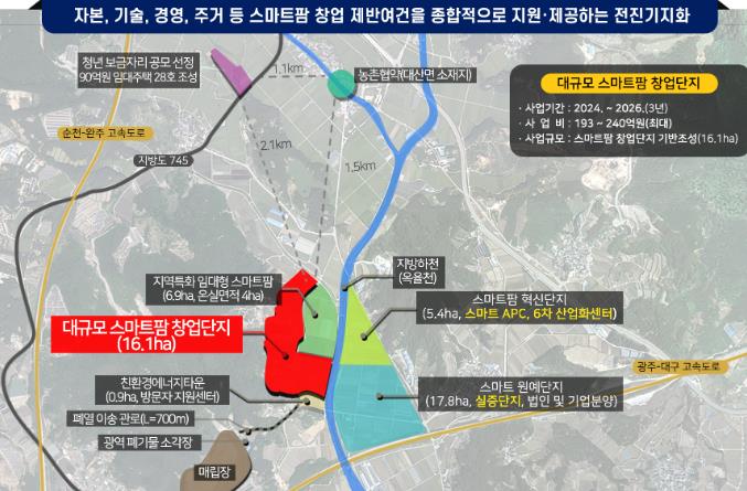 본 사업은 전북특별자치도 출범과 더불어 전국 최초로 시행되는 농생명산업지구 지정과 연계하여 에코에너지 스마트팜 혁신단지(47.1ha) 조성을 위한 마중물 사업으로 대산면 수덕리 일원 16.1ha에 2026년까지 사업비 최대240억원 전액 국비로 투입해 스마트팜 창업단지를 조성할 계획이다.