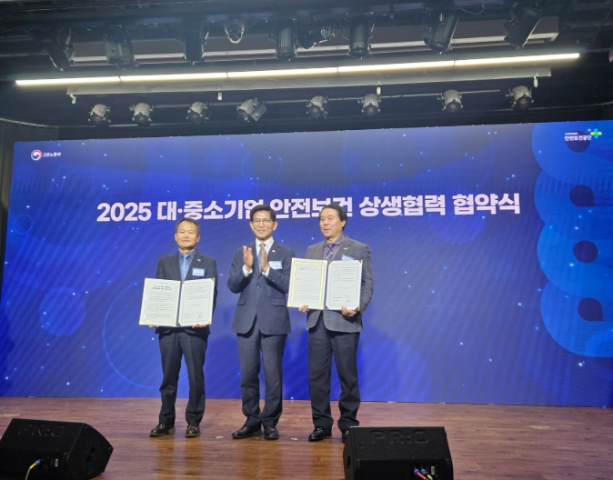 고용노동부 장관 주재로 서울 중구 은행회관에서 개최된 ‘2025년 대·중소기업 안전보건 상생협력사업 협약식’에서 JDC 부이사장과 협력업체(JDC 파트너스) 대표가 참석하여 협약을 체결했다.