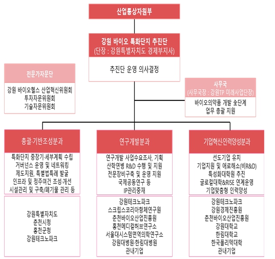 우선, 도와 시군, 혁신기관, 전문가가 참여하는 추진단을 구성하여 특화단지 조성과 연구개발, 인력양성, 기업유치 등 바이오산업 육성 전략을 마련하고, 추진단 구성과 운영이 안정된 이후에는 지역과 민간, 공공이 참여하는 특화단지 육성 전담조직을 빠른 시일 내에 출범하여 고도화된 추진체계를 갖출 계획이다.